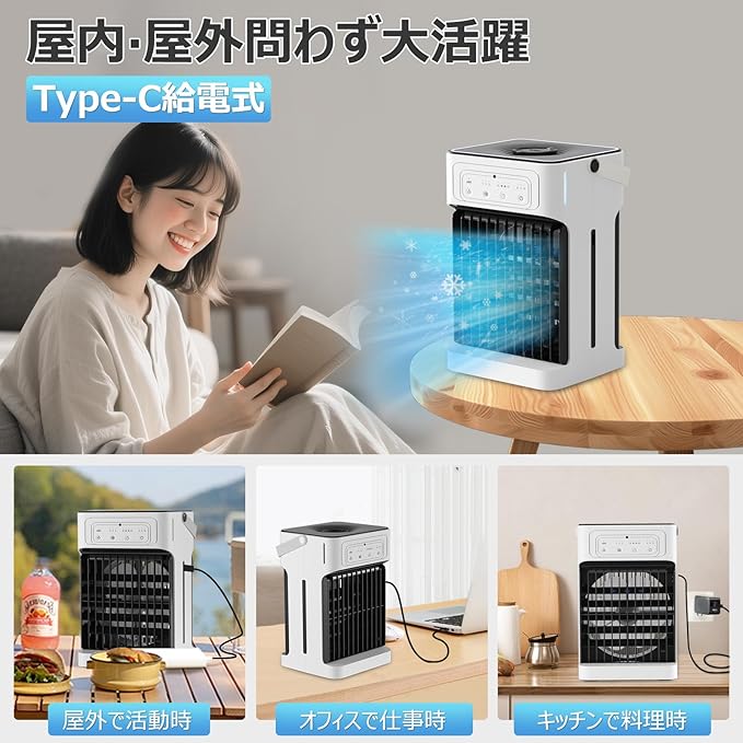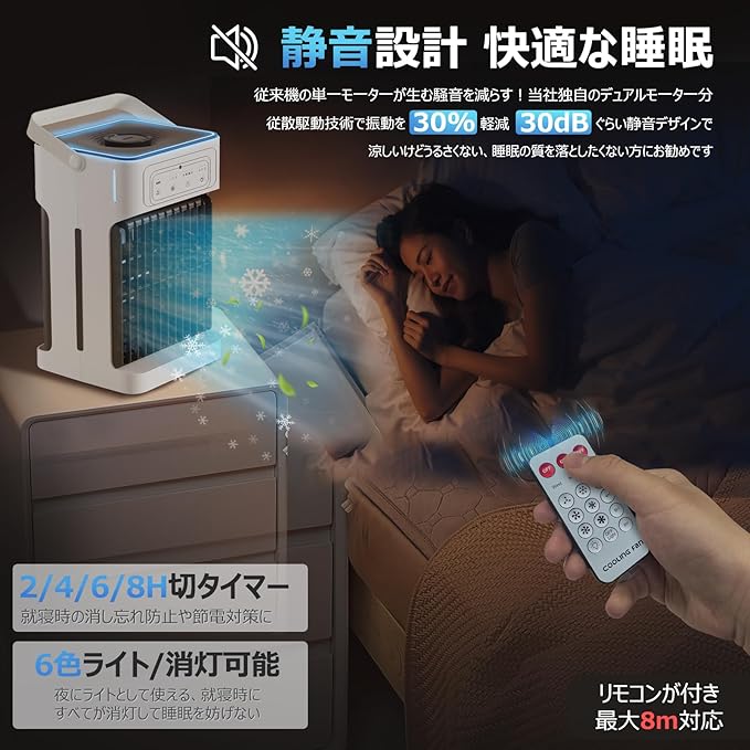 【8Mリモコン・切タイマー機能・夜間ライト・省エネ】 冷風機はタッチ操作やリモコン(8mの範囲)遠隔操作でき、真夏のとき快適なベッドやソファから離れる必要がない!2~8時間タイマー付きで、就寝時の消し忘れ防止や節電対策に。LEDライトは自由にON/OFFできて、柔らかな6色LEDライトがあります。夜間に起きる時照明ライトとしても使えます。そして、就寝時に消灯して、睡眠を妨げないです。消費電力はわずか9Wで、1時間当たりの電気料金は約0.24円、省エネと同時に、環境にも優しく、エアコンより95%以上の電気代を節約できます。そして、取っ手付きで持ち運び便利、いつでもどこでも涼しく! キッチン、オフィス、寝室、自宅、野外、車内などさまざまな場所に大活躍できますパッケージ内容:本体、日本語取扱説明書、1.5MUSBケーブル。サイズ:18.1*15* 27cm、重さ:1.3kg。ご購入日から1年間の安心.が付いております。.内容や連絡方法に関する詳細は、付属の説明書をご確認ください。(2年間の延長.)