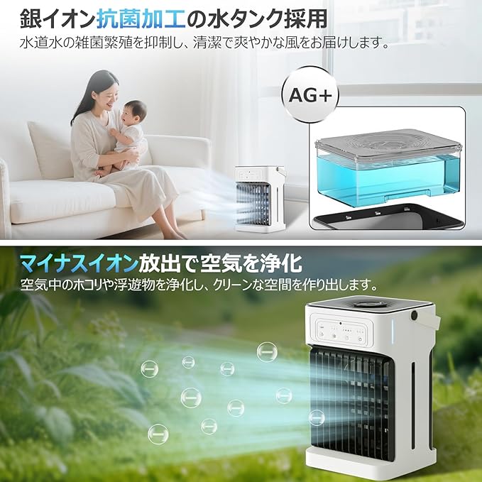 【 マイナスイオン空気清浄 &抗菌大容量タンク】冷風ミストモードと同時に冷風扇からマイナスイオンが放出され、空気中のホコリや浮遊物を浄化し、自分だけのクリーンな空間を作り出します。銀イオン抗菌加工済みのタンクは水道水中の雑菌繁殖を効率よく抑制、清潔なミスト風を常にお届けします。