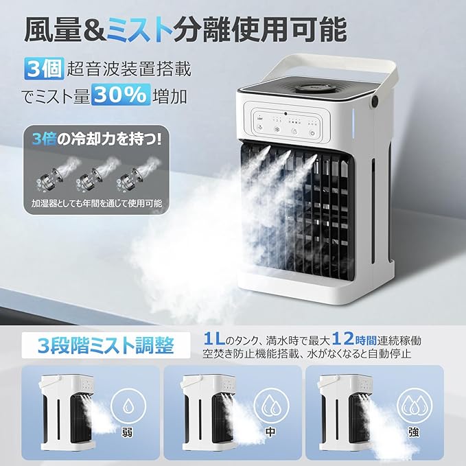 【3段階噴霧量・3倍冷却力で強い冷風が飛び出す・1000mL大容量タンク】この 強力冷風扇は革新の冷却技術を採用しており、「3個超音波装置」搭載の次世代冷却システムで、噴霧量30%アップ&3倍の冷却効率を実現します。タンクに水と氷を入れて風量とミスト量のボタンをタッチして始まり、3秒ぐらいに冷えた細かいミストを吹き出して周囲の気温を下げます。そして、風量&ミスト分離使用可能ので、夏に冷風+ミストでひんやり降温。冬にミスト単独運転で乾燥知らず、加湿器としても年間を通じてご使用いただけます。1000mlの大容量水タンク、一回のフル給水で最大12時間涼しさが持続し、夜繰り返し起きて水を入れる必要がなくて便利です。空焚き防止機能搭載、タンク内の水が一定の量まで無くなると自動的にミスト運転を停止します。透明な水位線、一目で水の残量を知ることができます。高級ABS樹脂&PP樹脂採用で耐久性抜群、特殊構造設計で水漏れゼロです。