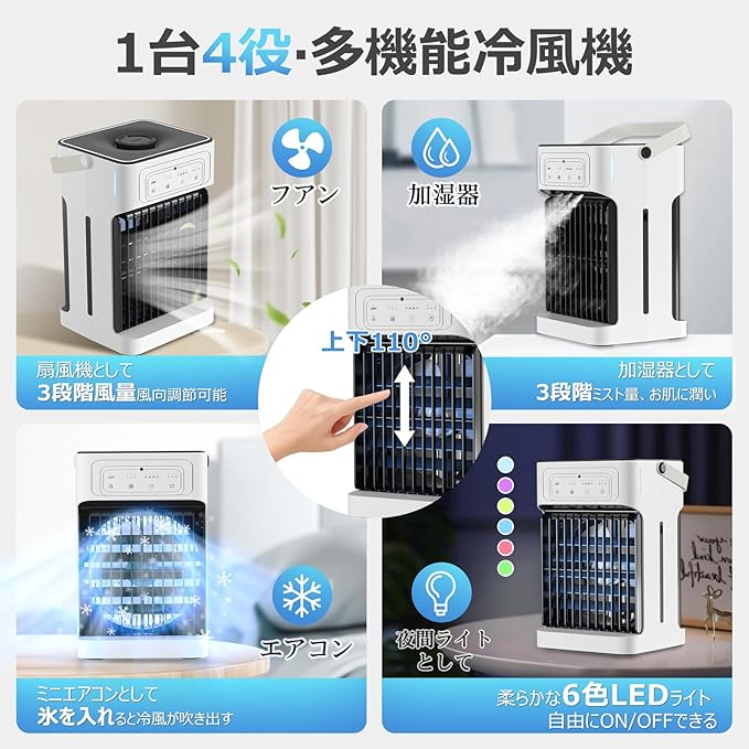 【一台4役・超涼しい強力冷風機 】 送風、加湿、冷却、6色ライトなど多機能が一体となっている冷風扇です。涼しさは3 Way選択可能:①「送風」優しい自然風を再現し、気楽にご利用できます。②「風+水」送風と同時に、繊細なミストも噴出されます。加湿効果があり、エアコンの涼しく快適な環境と加湿器の保湿効果を実現します。③「風+水+氷」水に氷を入れると、冷却機能を始める、めちゃくちゃ快適で涼しい。室温より最大-10℃のヒンヤリ冷風を楽しめます。