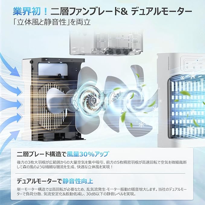 【業界初デュアルモーター設計で静音性&耐久性向上】YFFU冷風機は前部ブレードと後部ブレードを独立駆動するデュアルモーターを搭載。従来品とは異なり、高速回転を必要とせず十分な風量を確保できるため、気流が安定し振動を50%低減、騒音30dB以下の静音性を実現を実現します。仕事にお邪魔にならなくて、就寝時にも快適に使える冷風機です。さらに、デュアルモーターによる負荷分散設計により、過熱抑制とファン寿命の延伸を両立します。(※従来のシングルモーターでは、風量確保のために高回転が必要であり、風速のムラ/振動/騒音/過熱が発生しやすいです。)