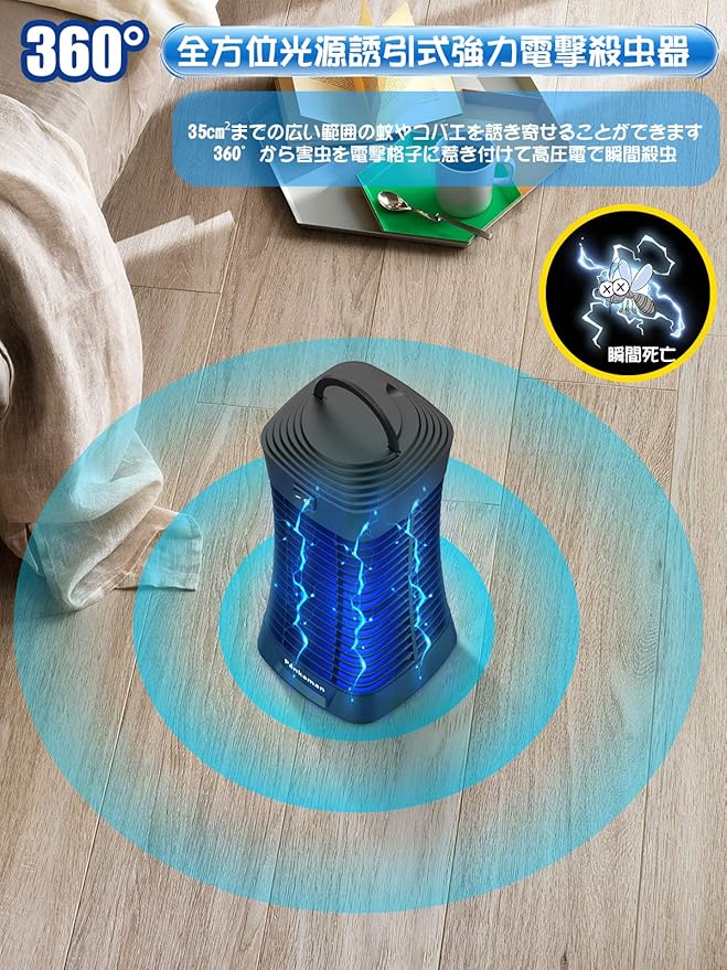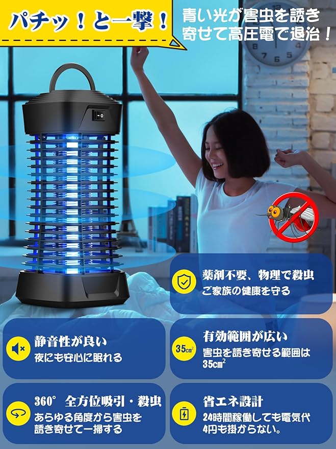 【薬剤不要・物理殺虫・安全健康】夏が来ると嫌な蚊が飛んでで鬱陶しいですね、蚊取り線香を使いたいが家に妊婦や小児がいたら健康に影響がないかと心配するかもしれませんが、この電撃殺虫器を使えばそのような心配は要りません。薬剤不要で火も使わず、物理で殺虫するので安心・快適に夏を過ごすことができます。