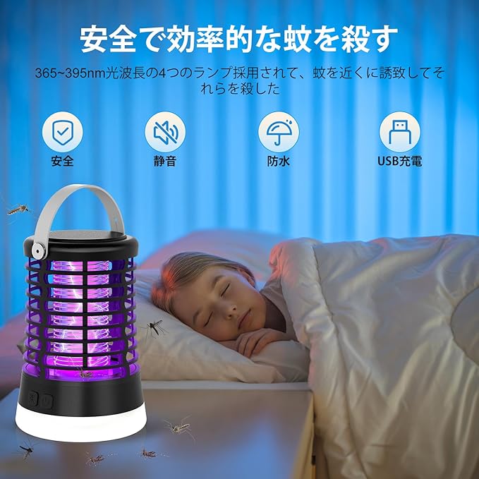 【置き&掛け両用・静かで省エネ】UV光源を使用して蚊を退治ために、運転する時に騒音が出さない、目に優しい光なので、睡眠に邪魔ならない。 製品自体にフックが付き、デスクトップに平置きして使用することができ、テント、パティオの出入り口など場所にも吊り下げて使用することができ、屋内や屋外両対応の蚊ライトです。製品にはLEDライトが付属しており、夜に照明使用することができ、大容量.で長時間使用することを確報し、屋外での使用に最適です。