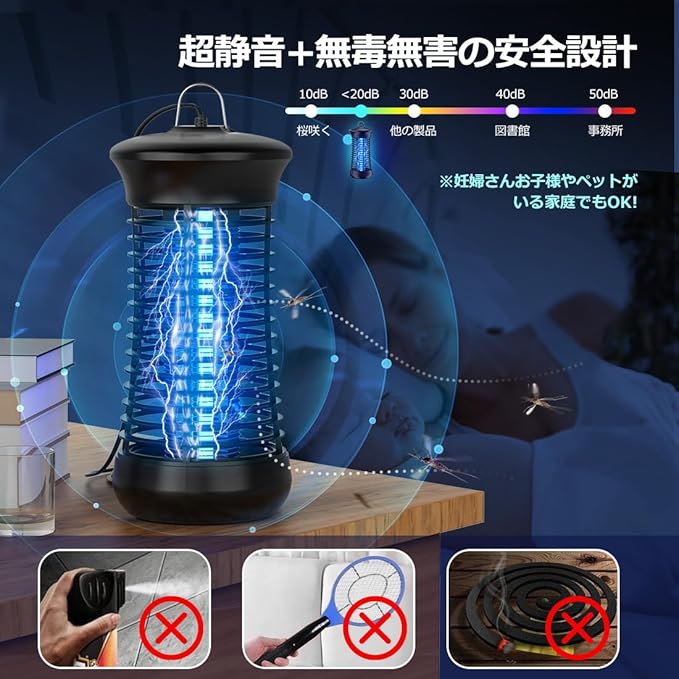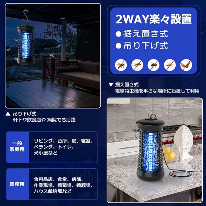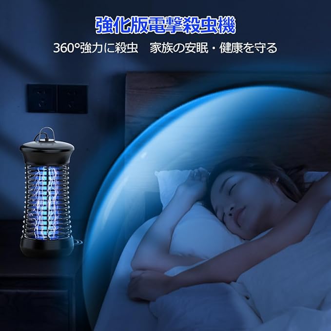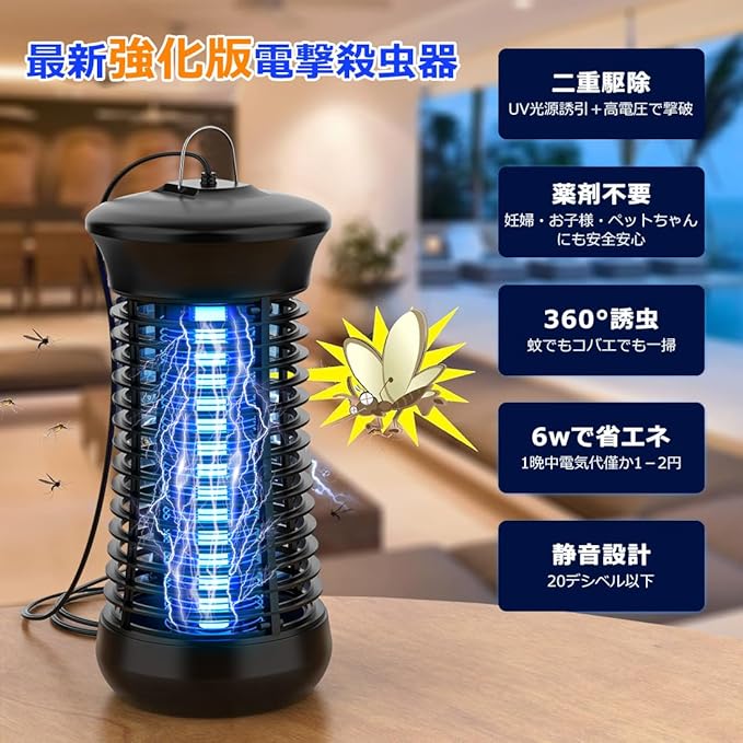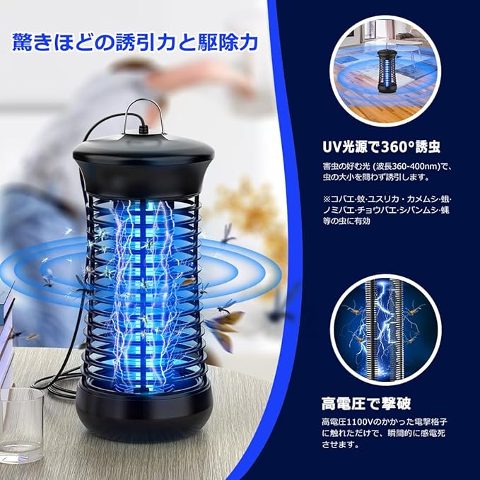 【2025強化版電撃殺虫器】2025強化版電撃殺虫器は下記4点を進化させて頂きました。❶uvライトの波長365nm(蚊を誘い込む波長)から360‐400nmまで広くて、誘引できる虫の種類はより多い。※アカイエカ、ヒトスジシマカ(ヤブカ)、チカイエカ、ネッタイシマカ、コバエ、ショウジョウバエ、チョウバエ、イエバエなど色々なの羽虫に有効!❷取替ランプを付属しており殺虫効果が弱くなる心配もなし!UVライトと電撃格子も改良し、蚊を誘引する効果や虫撃退耐久性が更に良くなり、より蚊の除去と省エネ効果を高めました!❸電源コードの長さを2メートルに延長して、電源を抜かずに電源オフが可能スイッチボタンも設置しました。❹S字フック付き、電撃殺虫器を吊り下げや卓上置きも可能になっております。ご注意:コバエ、蚊などの羽虫の飛行高さは1-1.8mですので、ご使用の際は床面より1m以上の高さ(距離)に吊り下げ(据え置き)ください。また、蚊の場合、人間の呼吸から発生する二酸化炭素、人間の匂いと体温などに誘引されるという性質がありますので、蚊による被害を防止するために、人から離れた場所に電撃殺虫器を設置してください。
