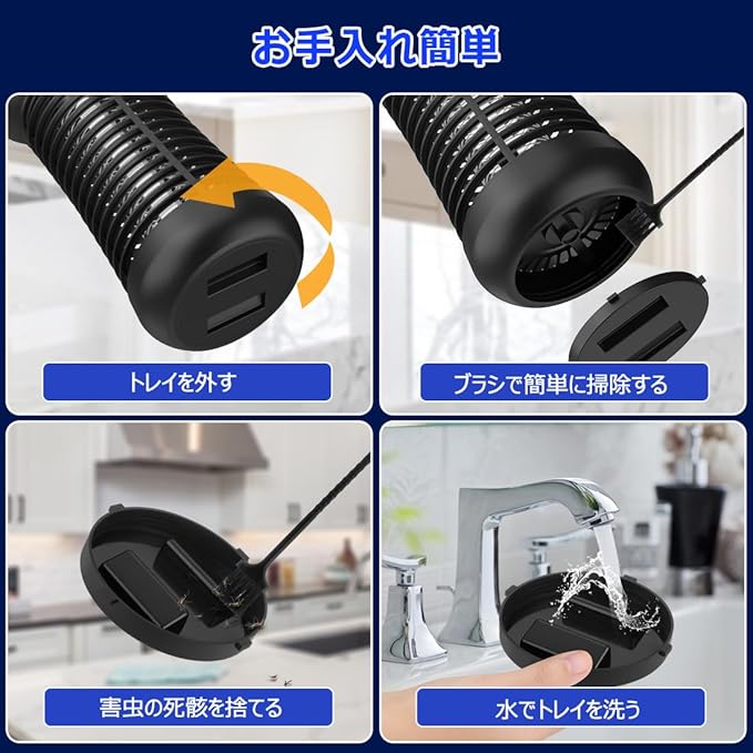 【吊り下げ・据え置き両用・お手入れ簡単】 電源を入れると、自動的に虫を取ります。重量はわずか0.5kgで、お子様やご年配の方でも持ち運びやすくて、とても便利です。小型で狭い空間でも大活躍です。また、蚊取り器の上部にフックが付いていますので、庭に吊り下げも可能、室内据え置きもでき、便利にご使用いただけます。しかも、本体の底にトレイがあるので、捕獲された害虫は収納され、付属されているブラシを使って、簡単に手を汚されず掃除できる。