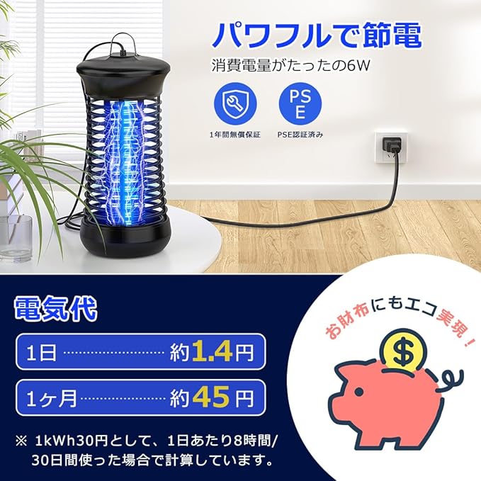 【PSE認証済み・安全安心→薬剤不要、無毒無害】この電撃殺虫器はPSE認証済みです!安心にご利用ください。(市販上でPSE無しの製品もありますので、ご注意ください!)光で虫を引き寄せ、電撃ショックで撃退する電撃殺虫器です。スプレーのような飛び散りが無く、殺虫剤の独特なニオイなどがしないので、人に優しく無害な殺虫器です。蚊取り線香よりも、物理的な方法で薬剤不要、毒素、煙や匂いなどが全くしなくて騒音もなし!安全且つ効果的!妊婦や赤ちゃんやペットがいるご家庭でも安心にお使い頂けます。