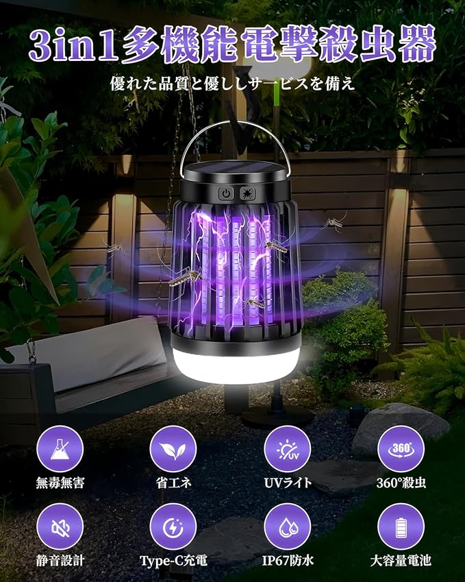 【操作簡単】操作が簡単で!コンセントに挿すだけで使えますか、日なたに置いて充電するだけで、電撃殺虫器の上部に吊り下げフックが付いている、使いやすく設置できます。庭に吊り下げも可能、室内据え置きもでき、便利にご使用いただけます。本体の底に受け皿があるので、駆除された害虫は収納され、掃除用ブラシを使って、簡単に手を汚されず掃除できる。直接に蛇口下で製品中に残った蚊の死骸を洗い流すことができます、お手入れも非常に便利です。パッケージ内容:電撃殺虫器本体*1、掃除ブラシ*1、2M充電ケーブル*1、日本語取扱説明書*1「出品者に連絡」までお問い合わせください。必ず最善を尽くし、ご対応いたします。