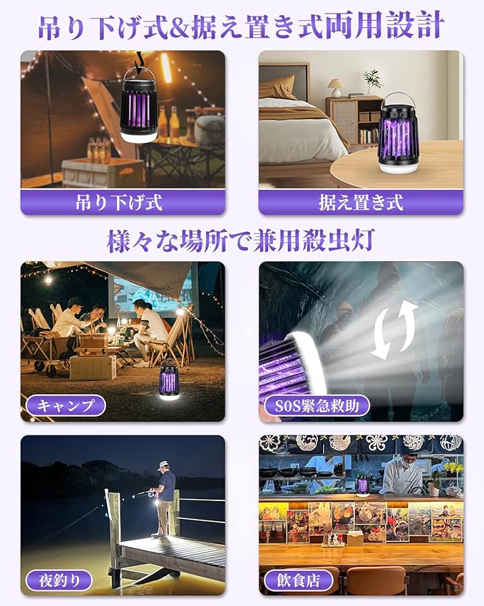 【吊り下げ&据え置き両用&幅広い用途】本品は手軽に持ち運べる電撃殺虫器なので、吊り下げと据え置きで使用できます。付属のフックで吊り下げて設置できます。室内だけでなく、屋外にも使用でき、便利にご使用いただけます。◆室内用:玄関、リビングルーム、子供部屋 ◆室外用:庭、海辺、公園、夜釣り、キャンプ、登山、旅行など ◆業務用:食料品店、食堂、民宿、作業現場、養鶏場、養豚場、ハウス栽培場など。