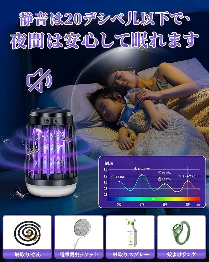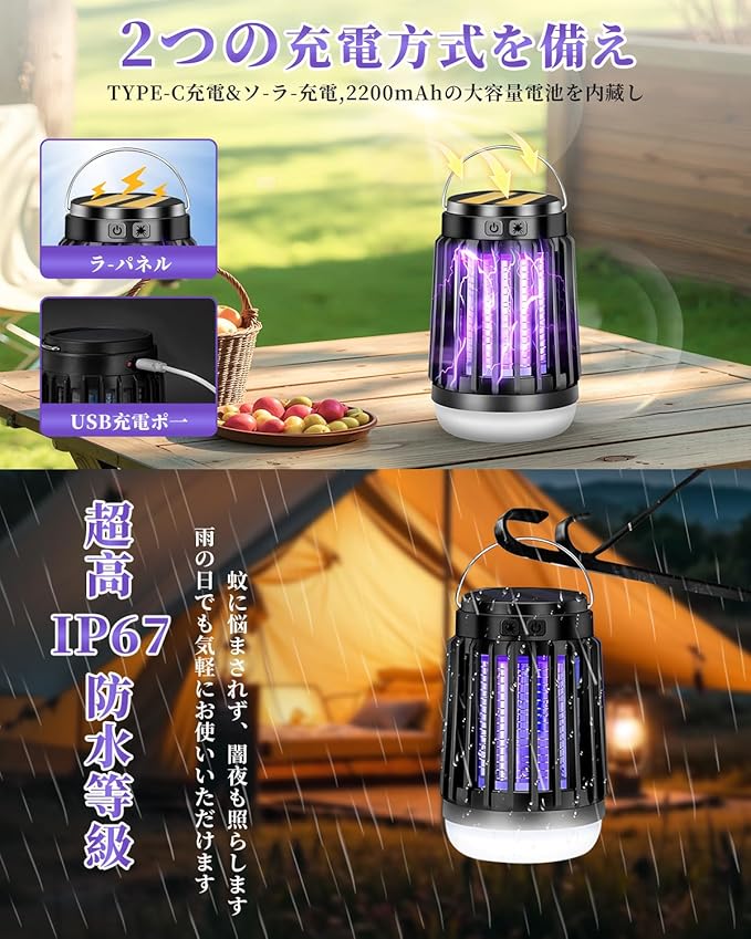 【静音設計・省エネ設計・IP67防水】稼働音は20db以下で、人間の耳では聞き取れないほどの音です。無音と言ってもいいです。夜には静かに眠れます。2200mAh.が内蔵され、高品質リチウムイオン材料で製造され、長寿命かつ安定した性能を実現しています。 他の蚊取り器と違い,電源ボタンは防水キャンプ設計され、超高水準のIP67防水仕様の電気蚊取り器です、屋内屋外でもご安心に使用いただけます。