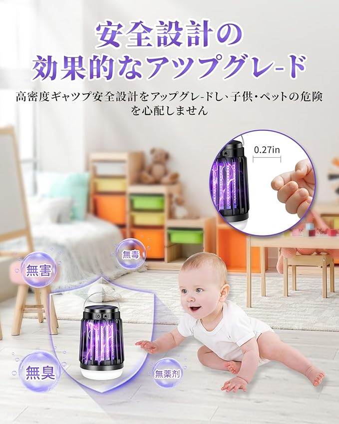 【物理蚊除け・薬剤不使用・安全設計】AI誘捕システム、360 全方位UV光源吸引式なので、物理的に蚊を殺します、 由于不使用任何化学物质,杀虫灯在工作时不会散发任何气味、烟雾或有害化学物质,パシッとなどの騒ぎがなしに、火もなしに、内部には密集な静電ネット式な設計なので、虫などを逃げられないです。電撃殺虫器は高品質で環境保護ABS素材を採用し、高密度のシェルギャップは6mmであるため、指が高電圧ネットに誤って触れるのを効果的に防ぐことができます。妊婦さんと赤ちゃんと犬・猫などのペットがいるご家庭でも安心してお使いいただけます。