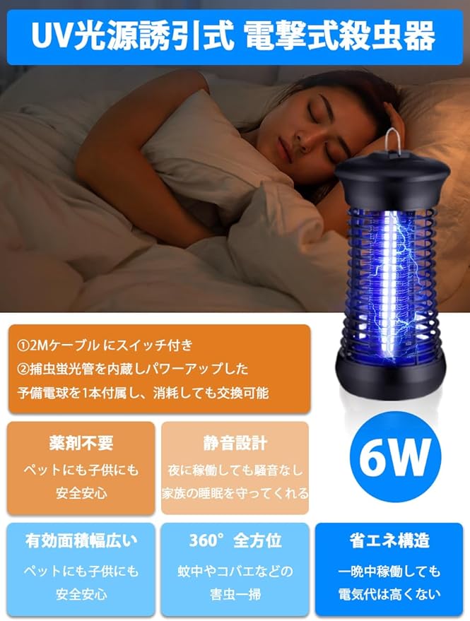【静音設計蚊取り 電気&PSE認証済】従来のファン式コバエ取り 電気 と違い、羽根が無いので静かに動きます。(2022年10月の改良版となり、交換用電球を1つ付属しております。また、6Wの電球を使用しないといけない為、電球を交換するのが必要な時、付属している電球を使用するのはおすすめです。)目に優しい光なので、睡眠に邪魔ならない。このコバエ取りは6Wの補虫蛍光管を内蔵してパワーアップ、従来品より有効範囲が広がりまして、360 全方位スキャナーしたりして蚊などを誘惑します。光で虫を引き寄せ、電撃ショックで撃退する捕虫器です。スプレーのような飛び散りが無く、殺虫剤の独特なニオイなどがしないので、人に優しく無害な殺虫器です,また、この電撃殺虫器はPSE認証済みです!安心にご利用ください。(市販上でPSE無しの捕虫器もありますので、ご注意してください!)