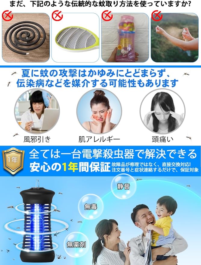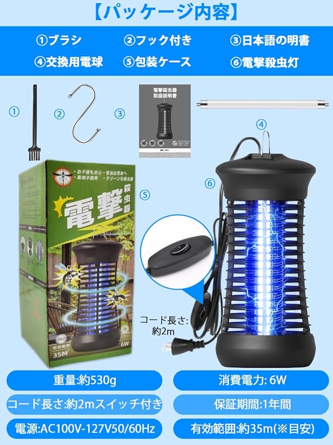 【信頼できる1年間.】パッケージト内容:電気殺虫機本体*1、付属ブラシ*1、オリジナルの予備電球付き。捕虫器は12ヶ月の品質.があり、ご使用いただいている電撃殺虫機に、破損したり、不具合と思われる事象が生じた場合、確認後、迅速に対応させていただきます。新品の交換、修理、使用指導などのサービスをご用意しております。ご安心ください。さらに、本製品は屋外で使用することができますが、屋外で使用する場合は、電源が接続できる必要があり、屋外で使用する場合は、製品が水に浸からないようにする必要があります。 水が浸入した場合、電源を切り、.に連絡し対処してもらう必要があります。