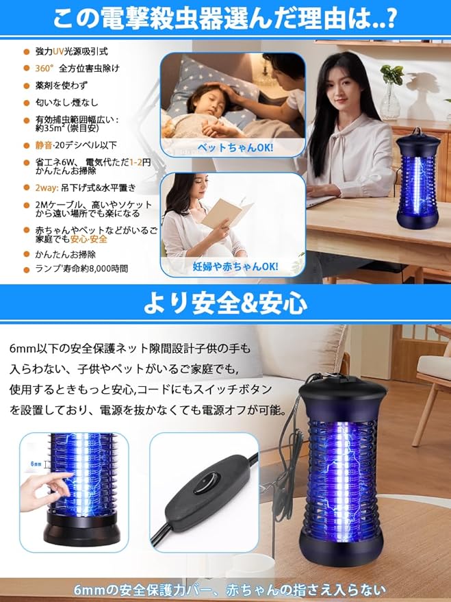 【安全設計虫取り&様々な場所で大活躍 】外枠には絶縁材(難燃性ABS仕様)を使用し、より高い安全性。超軽量でコンパクトなデザインで、持運びや保管なども楽にできます。手軽に持ち運べる電気蚊取り器ので、どこでも置くことができます。大切な家族を害虫から守れます。吊り下げても据え置きでも使えるので、使い場所を選びません。この殺虫器はキッチン、リビングルーム、子供部屋、寝室、玄関、オフィス、飲食店など様々な場所でお使いいただけます。薬剤など一切使用していないので人体に無害です。人に優しく、オフィスや事務所のエントランス、病院の待合室などにもオススメです。お子様やペットがいる家庭でも安心してご使用いただけます。家庭用:庭、台所、ベランダ、トイレ、犬 猫小屋、寝室、リビング、キャンプなど。業務用:食料品店、オフィス、食堂、民宿、病院、作業現場、養鶏場、倉庫、飲食店など。ご注意:雨滴のかかる場所や多湿の場所で、コンセントがあれば、水のかからない場所で使用できます。