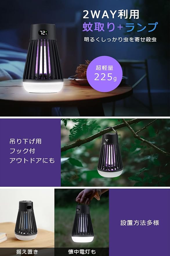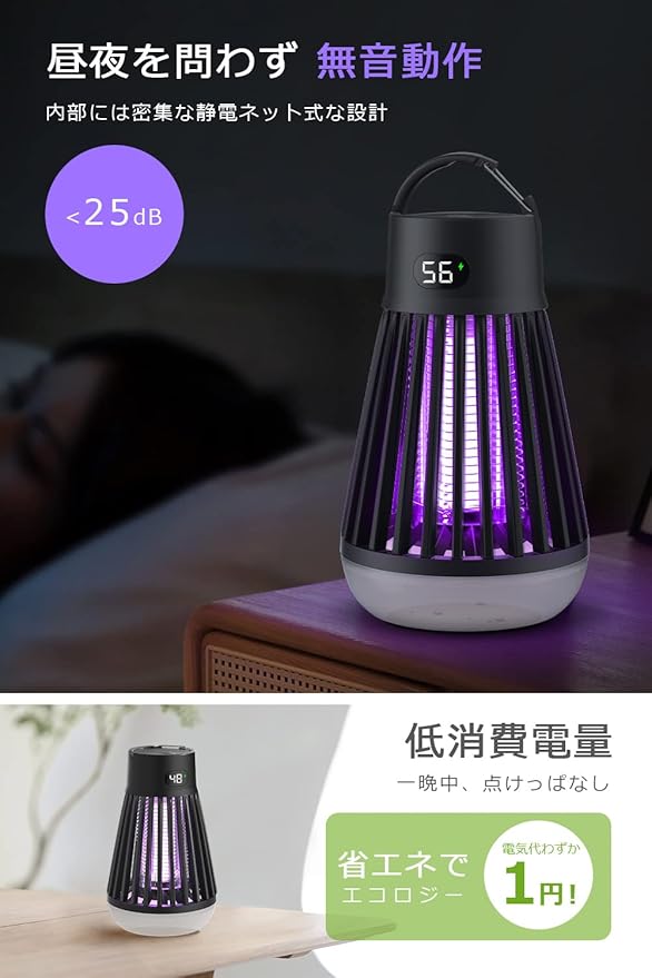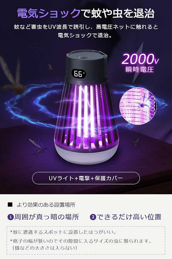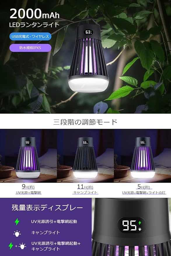 電撃殺虫器 電気蚊取り器 【電撃殺虫灯・LEDランプ2in1】 usb充電式 2000mAh大容量 UV光源吸引式 殺虫ライト LED誘虫灯 薬剤不用 蚊除け 強力殺虫 捕虫器 吊り下げ 据え置き 蚊取りライト コバエ取り 残量表示 無音 蚊取り 虫取り 室内 家庭用 寝室/台所/玄関/居間/オフィス/飲食店/キャンプ/停電などに適用 省エネ お手入れ簡単 掃除ブラシ付き (黒) | oioioichan