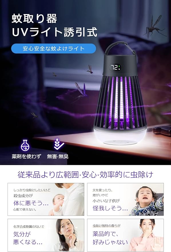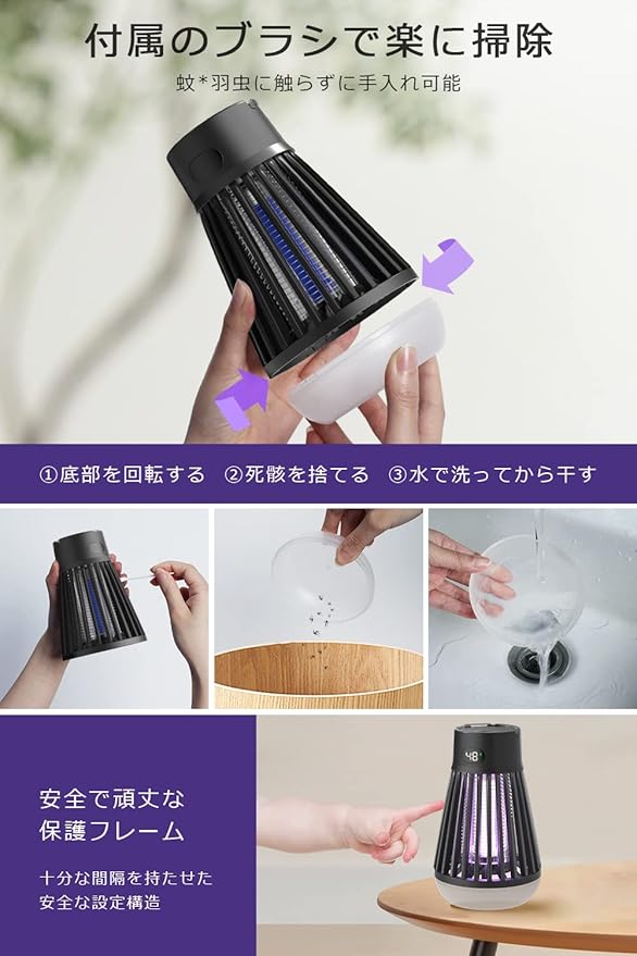 【充電式長時間持続 残量表示付き】2000mAh.が内蔵され、充電して繰り返し使用可能な電気蚊取りライトです。一回のフル充電で最大11時間連続点灯可能、しっかり虫から身を守り、朝までぐっすり!殺虫器のボタンを押して点灯し、LCDディスプレイに電池残量が分かりやすく表示され、充電のタイミングもより掴みやすくい。使用後、付属の掃除ブラシで虫の残骸を取り除き、手を汚されずに掃除できます。