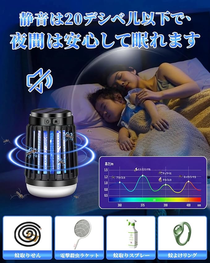 【静音設計・省エネ設計・IP67防水】稼働音は20db以下で、人間の耳では聞き取れないほどの音です。無音と言ってもいいです。夜には静かに眠れます。2200mAh.が内蔵され、高品質リチウムイオン材料で製造され、長寿命かつ安定した性能を実現しています。 他の蚊取り器と違い,電源ボタンは防水キャンプ設計され、超高水準のIPX6防水仕様の電気蚊取り器です、屋内屋外でもご安心に使用いただけます。