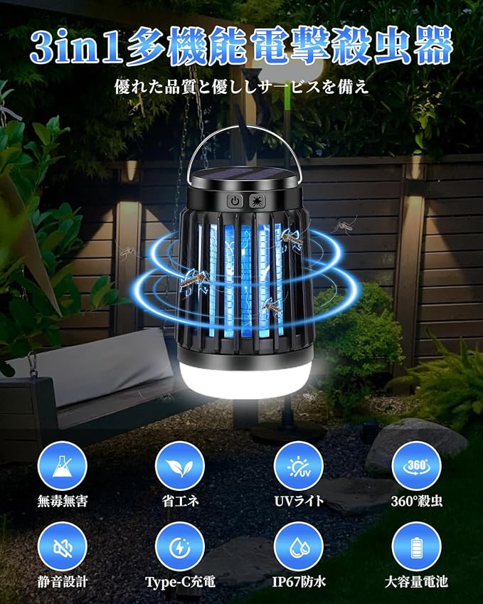操作が簡単で!コンセントに挿すだけで使えますか、日なたに置いて充電するだけで、電撃殺虫器の上部に吊り下げフックが付いている、使いやすく設置できます。庭に吊り下げも可能、室内据え置きもでき、便利にご使用いただけます。本体の底に受け皿があるので、駆除された害虫は収納され、掃除用ブラシを使って、簡単に手を汚されず掃除できる。直接に蛇口下で製品中に残った蚊の死骸を洗い流すことができます、お手入れも非常に便利です。パッケージ内容:電撃殺虫器本体*1、2M充電ケーブル*1、日本語取扱説明書*1「出品者に連絡」までお問い合わせください。必ず最善を尽くし、ご対応いたします。