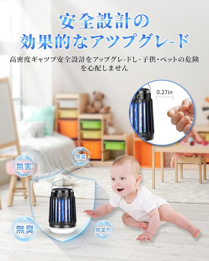 【物理蚊除け・薬剤不使用・安全設計】AI誘捕システム、360 全方位UV光源吸引式なので、物理的に蚊を殺します、 由于不使用任何化学物质,杀虫灯在工作时不会散发任何气味、烟雾或有害化学物质,パシッとなどの騒ぎがなしに、火もなしに、内部には密集な静電ネット式な設計なので、虫などを逃げられないです。電撃殺虫器は高品質で環境保護ABS素材を採用し、高密度のシェルギャップは6mmであるため、指が高電圧ネットに誤って触れるのを効果的に防ぐことができます。妊婦さんと赤ちゃんと犬・猫などのペットがいるご家庭でも安心してお使いいただけます。