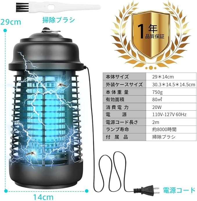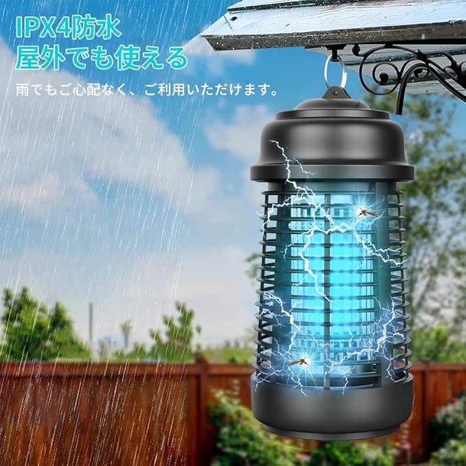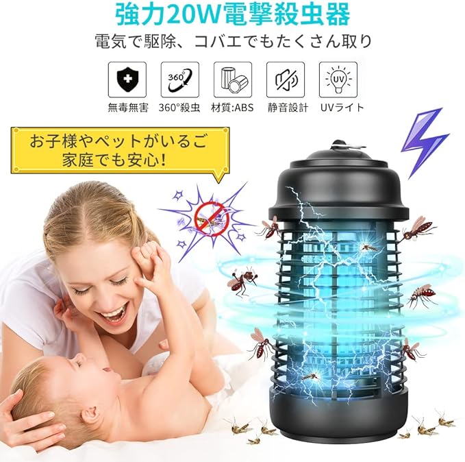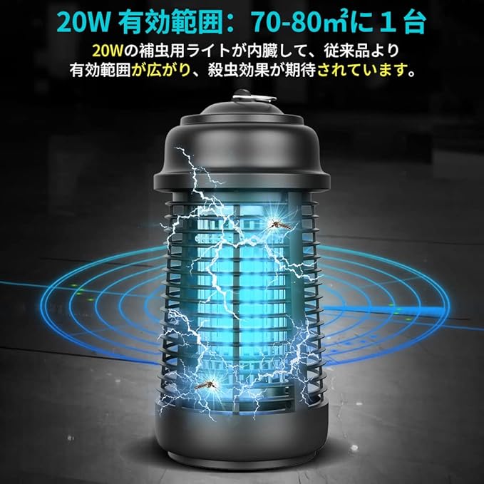 【最新20W &IPX4防水電撃殺虫機】害虫が好む光に集まる習性を利用して、紫外線ライトで誘導して、高圧電網でパシッと電撃与えて殺虫する電撃殺虫機、捕虫蚊よけライトです。殺虫ライトはUV光源誘引式を採用されているから、薬剤など使わず、電撃で一瞬蚊や蛾などの虫を殺す!無害でありながら80平方メートル広範囲に渡って害虫から守ってくれます。IPX4防水規格です、アウトドアで雨に濡れても大丈夫です。(ご注意:コンセントを水がかかる場所を入れないでください。