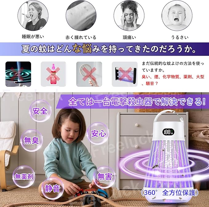 【2025最新進化・多機能電撃殺虫器&360 強力蚊除け】最新技術のマルチバンド周波数変換ランプビーズを用いて蚊を誘引し、害虫の好きな光が集まる習性を利用して、紫外線ランプで導き、害虫が内側の高圧電撃網に接触して瞬間的に感電して死亡する。電撃蚊取り器には2Wの虫取り蛍光管が内蔵され、360 全方位で虫などを誘惑することができる。害虫が好む光(波長360〜400 nm)、この物理光波は365 nm(蚊誘引)、395nm(蛾誘引)、410 nm(コバエ誘引)であり、市販上の365nmの電撃殺虫機より誘引できる害虫の種類は多くなる、虫を引き寄せることが効果的です。ランプ管の周囲には2000Vの高圧ネットを使用しており、感電で蚊などの飛虫を瞬時殺虫!これは強力な蚊取り器だけでなく、LEDライトでもあります。3つのモードは調節でき、電撃殺虫モード、LED照明モード、電撃殺虫+LEDランプ照明モード。