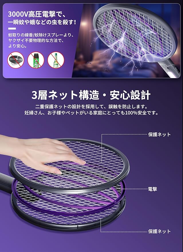 【折り畳み式で収納&携帯便利】 180度回転するの蚊取り器で、手に持って使ったり、壁にかけしたり、床に設置して置き型にしたりと3通りの使いかたが可能。簡単に折りたたむことができる省スペース設計です。 三層構造のネットで、外側には電気が流れておらず、ガードの役割を果たし安全性を高めています。高い空間にかけるので、誤って触ってしまうことも少なく、子供やペットのいる家庭でも使えます。