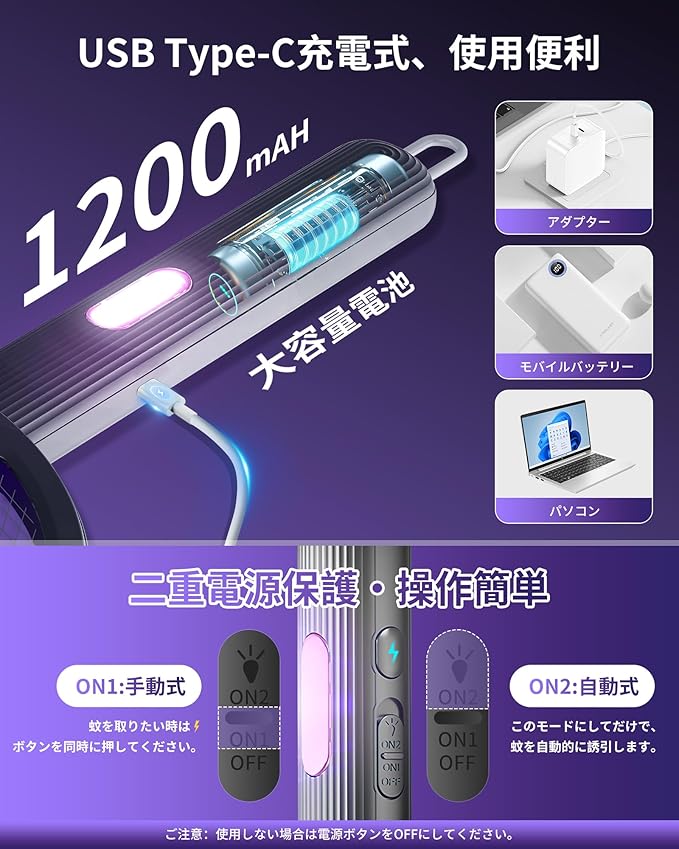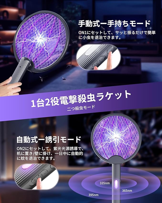 【手持ちモード&誘引モード・ヤクザイ不要】本電撃殺虫器は、ラケットとして手動式だけでなく、誘引モードにはそのままに置きて、虫が好きな電気を使っておびき寄せ、近づいた虫を高電圧で殺すことができます。また、薬剤が使われていません、そのため、お部屋の空気を汚さずに活用することができます。