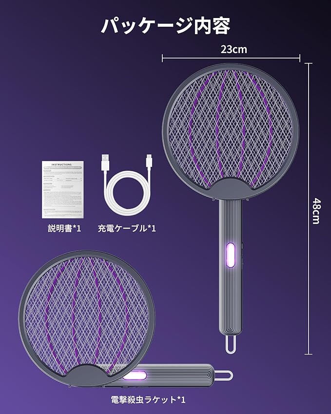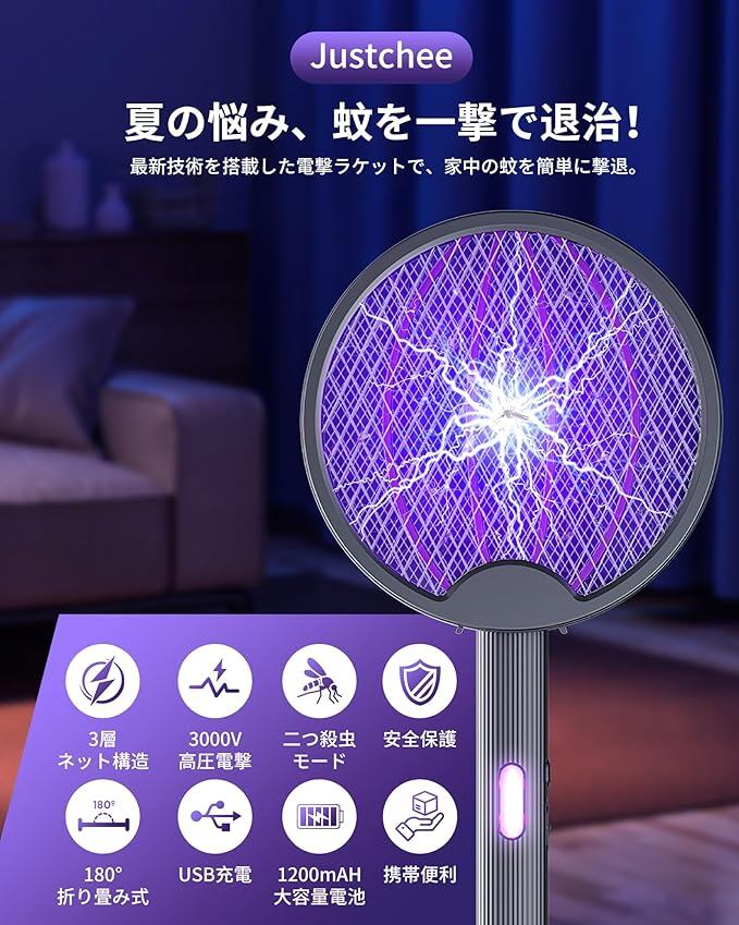 【2025新型2 IN 1電撃殺虫ラケット!3000V快速蚊虫を退治】年中どこかしらからやってくる虫。特に夏場の蚊やユスリカ、コバエにお悩みの方は多いでしょう。虫が電撃殺虫器に近づいてくるのを待つのではなく、自らラケットを握り、虫を叩き出して退治します。虫を見つけ次第、即座に使用できるのが便利です。Justchee最新の電撃殺虫ラッケトはアップグレード3000Vの高圧電撃式デザインを採用して、接触した蚊、ハエ、クモなどの虫を簡単に退治できます。さまざまな種類の虫に対応しているので、室内・屋外共に使用することができます。