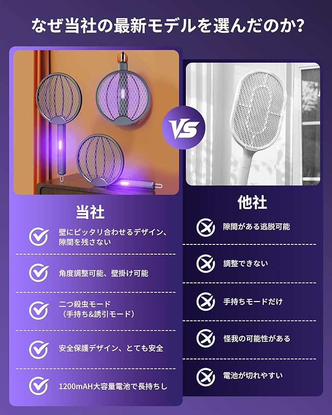 【壁面に密着でき・蚊を逃さないデザイン】 壁と挟める設計で、壁面にぴったり密着、とまっている虫をとらえやすい。従来のラケットでは届きにくかった隅っこの蚊も、これでしっかりキャッチ!特に天井近くに集まる蚊も逃しません。さらに、広い撃退面で一度に複数の蚊を撃退できるので、効率的に家中の蚊を退治できます。
