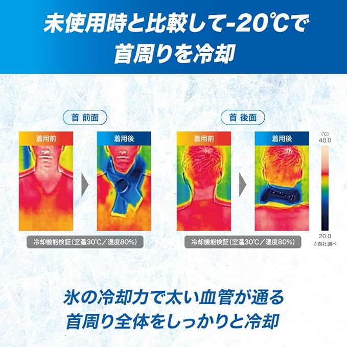 【未使用時と比較して-20℃で首回りを冷やす】氷の冷却力で太い血管が通る首回り全体を広範囲に冷やします。