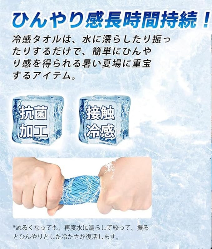 【使い方】水を浸して適度に絞るだけ!水に濡らし絞って振ることで、気化熱による高い冷却性を発揮します。