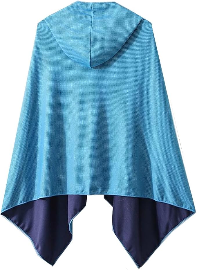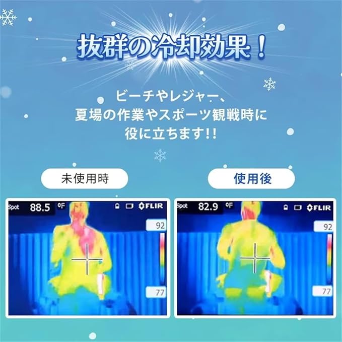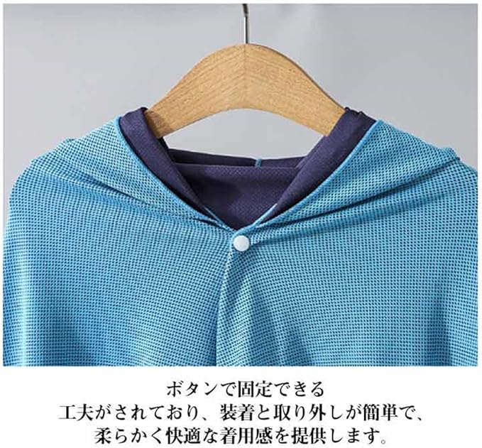 【ひんやり】接触冷感の生地を使用、水に濡らして振るだけでひんやり気持ちいい!頭部と全身をカバーするフード付きのポンチョ形状としたことで、全身を快適に冷やすことができます。