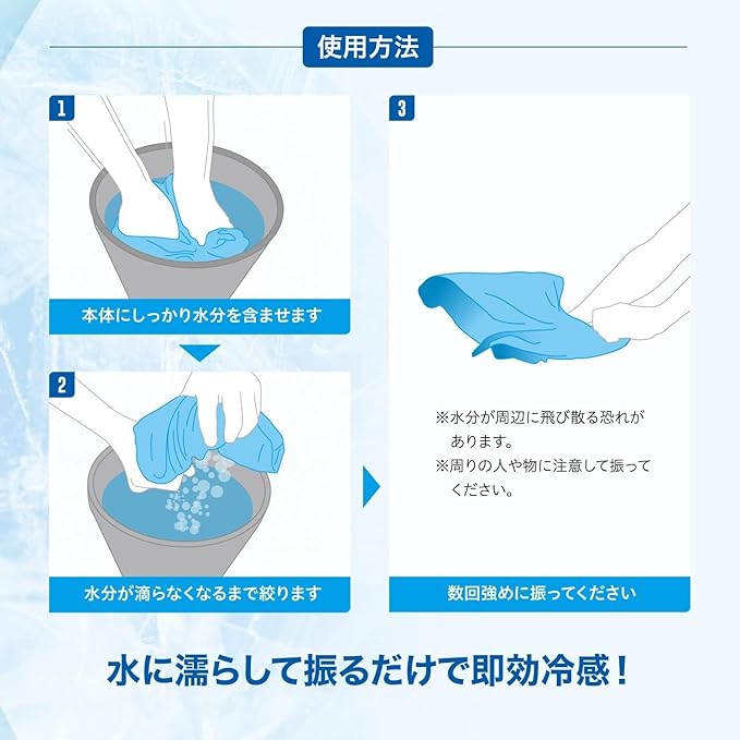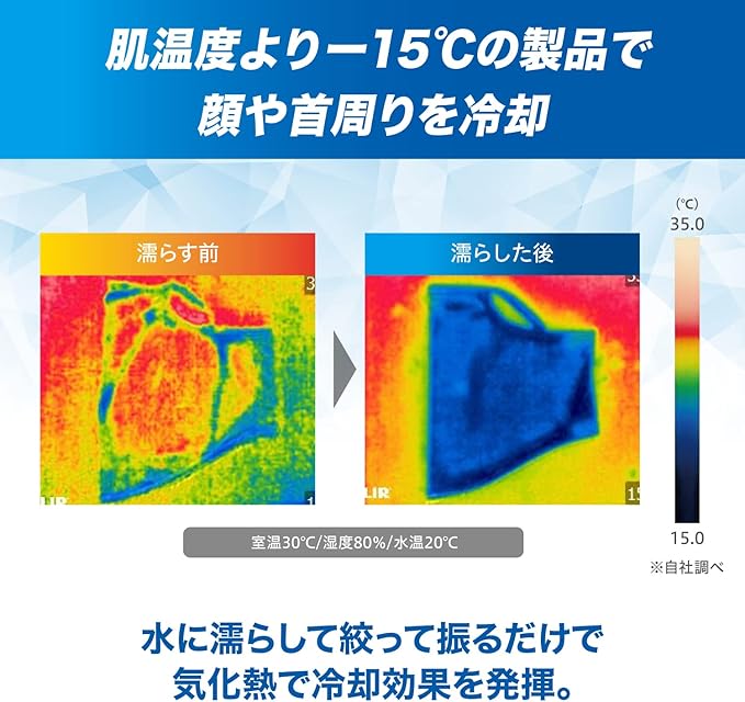 【肌温度よりー15℃の製品で顔や首周りを冷却】水に濡らして絞って振るだけで気化熱で冷却効果を発揮。接触冷感素材なので、濡らさなくても冷たさを感じることができます。暑さ対策グッズとして活躍します。