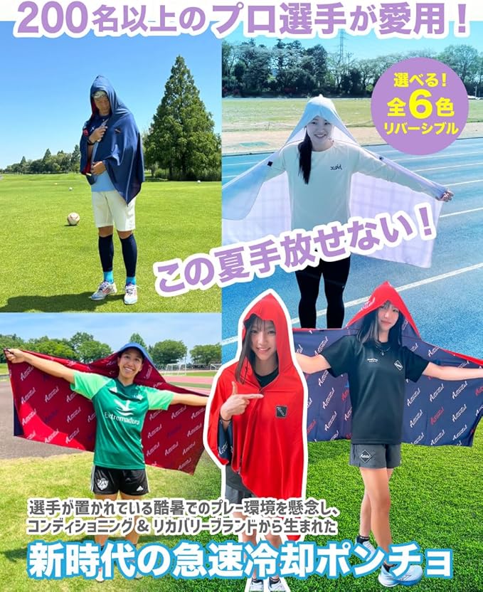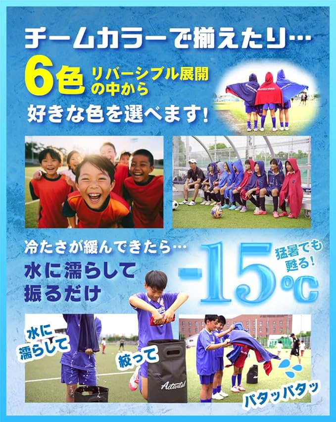 試合前後のアイシングやクールダウンにも大活躍。プレーヤーだけでなく、熱中症やUVダメージを防ぎたいすべての方におすすめです。