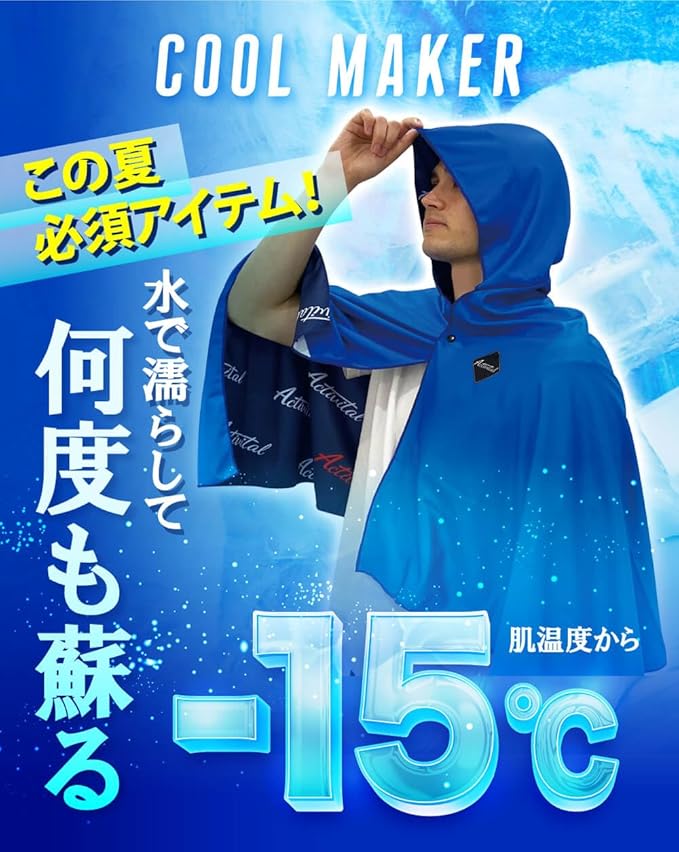 COOL MAKERは冷却タオルポンチョです。濡らして絞り、振るだけで生地が-15℃の冷感を発揮し、体の中心温度を効果的に下げます。