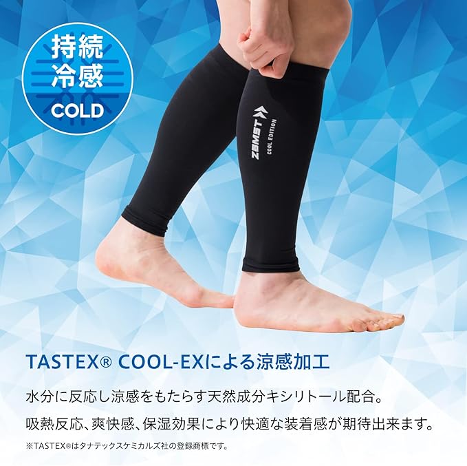 【TASTEX COOL-EXによる涼感加工】TASTEX COOL-EXは、水分に反応し涼感をもたらす天然成分キシリトールを配合しています。キシリトールの吸熱反応、保湿効果による高い装着感が期待出来ます。 未加工品と比べて生地自体の温度が約-1.1℃ダウン!(自社調べ) ※TASTEXはタナテックスケミカルズ社のです。