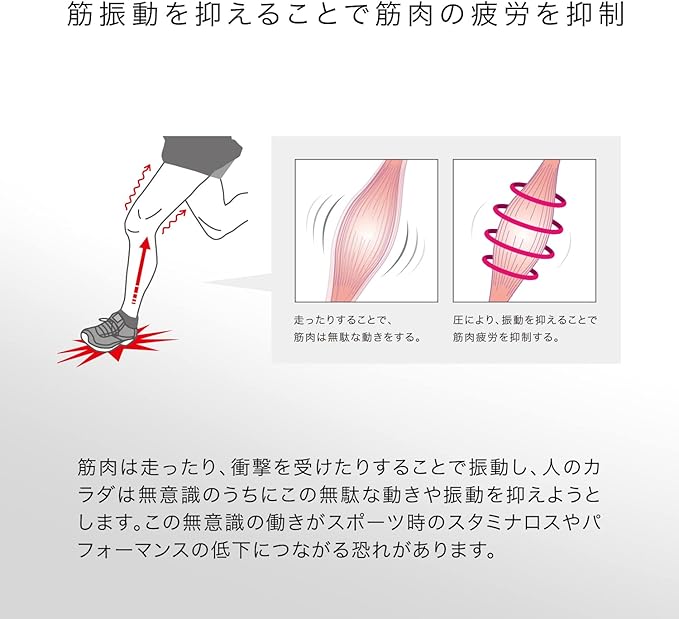 【段階着圧設計と筋振動抑制機能】足首からふくらはぎにかけて圧力を段階的に弱める設計で、疲れやすいふくらはぎをサポート。また、ふくらはぎ全体を圧迫することで、疲労につながる筋肉の無駄な揺れを抑えます。