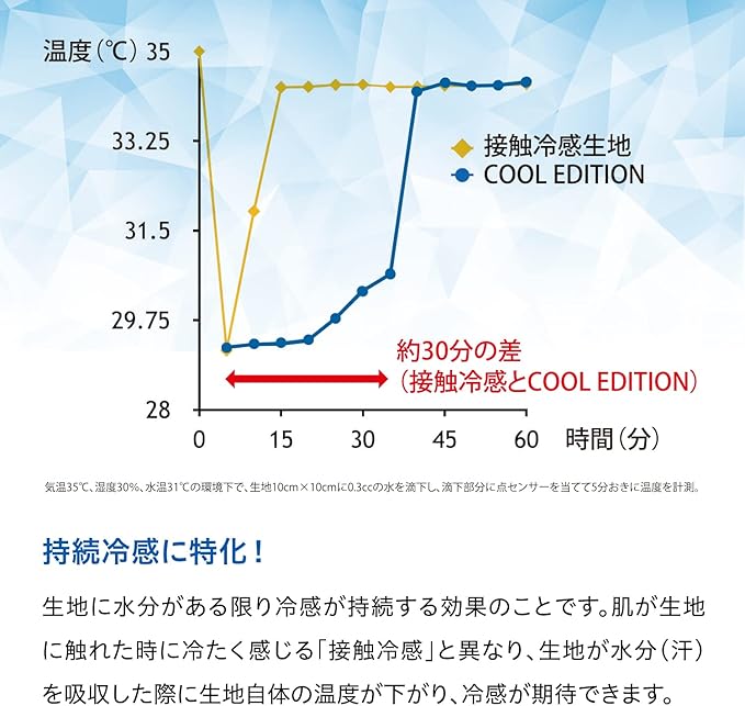 【持続冷感に特化】持続冷感とは生地に水分がある限り冷感が持続する効果のことです。肌が生地に触れたときに冷たく感じる「接触冷感」と異なり、生地が水分(汗)を吸収した際に生地自体の温度が下がり、冷感が期待できます。