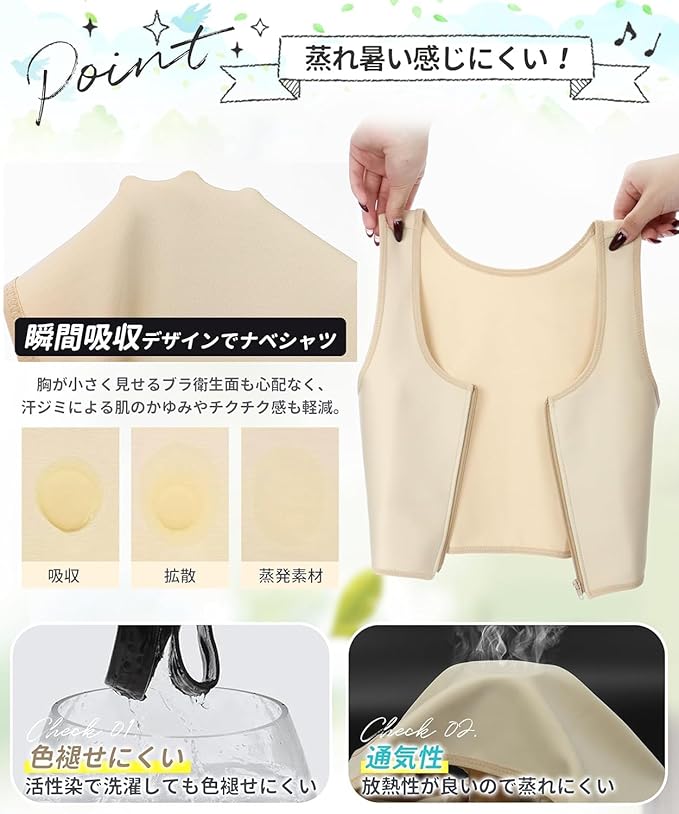 【簡単に使え小さく見せるブラ】ナベシャツ 胸が小さく見せるブラは前ファスナー設計で、体をよりよく包み、着脱しやすい、後ろに手が届かない女性も楽に使えナベシャツ。胸が小さく見せるブラ全体がノンワイヤーブラデザインで皮膚や胸を傷つけることを心配がない。乳房全体を覆い、締め付けをより均一に感じさせ、胸の潰す効果を高めます。着物や和服の下に着る 和装ブラ、制服や作業服、スポーツ、ダンス、ヨガなど、運動シーンでも大活躍ナベシャツ 胸が小さく見せるブラ。
