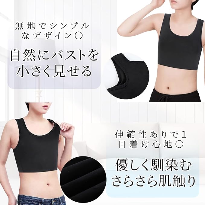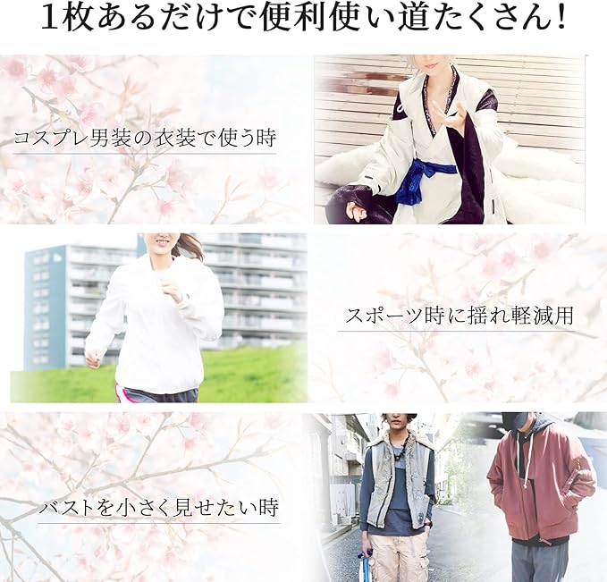 5:「多用途」シンプルで使いやすいさらしブラは、バストまわりをすっきりと見せ、揺れ防止にもぴったりで。普段のお出かけや、胸が邪魔になりがちなスポーツ中のほか、男装やコスプレ用のインナーとしてもおすすめです!胸つぶしシャツがバストを自然に潰す事で美しいシルエットに見せます。