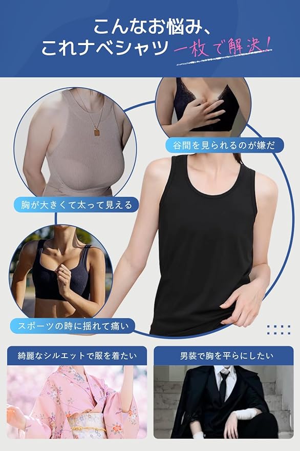 【どんなシーンでも1枚あれば十分】胸を平らにして、男の子のようにカッコイイになりたい場合や、大きな胸で不自信な場合も多用途で使える便利な胸つぶしタンクトップです。男装・コスプレ・スポーツ・部活・和装・ダンスなどの様々なシーンで大活躍しています。