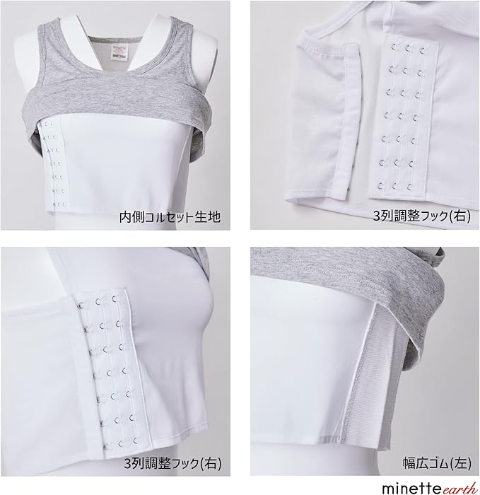 ✅【ミネットアースのナベシャツ内部構造】左側:伸縮性の高い高品質8cm幅広ゴムを、右側:3列7段フックで強力&ダブル締めを実現。 高品質な素材で締め付け感と耐久性が更にUP!!