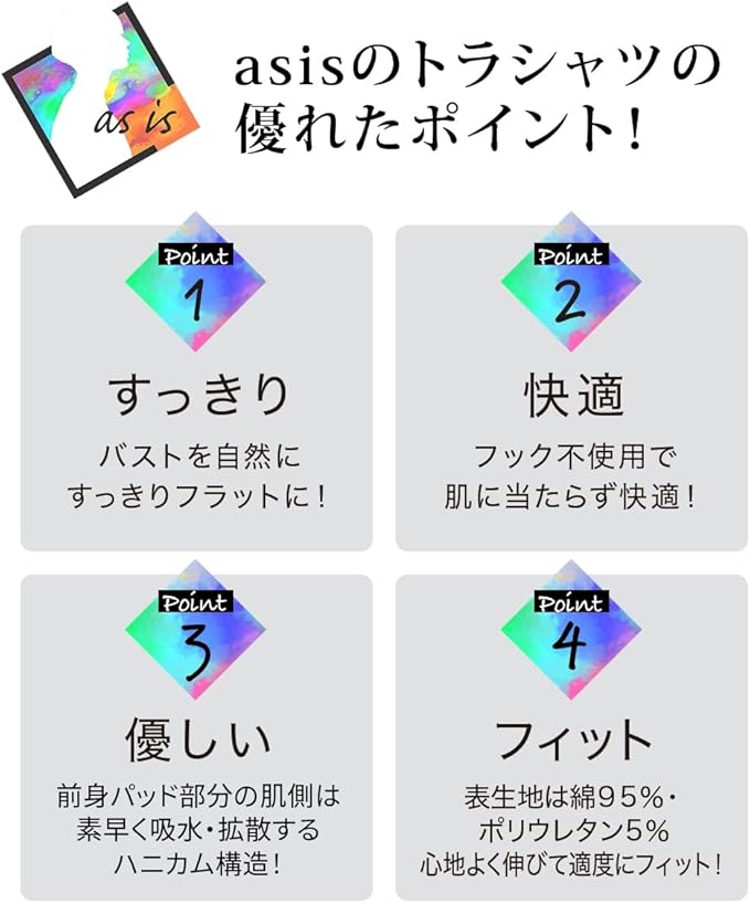 ・着心地快適 フックを使っていないので、脇に当たらず着心地も快適です。胸元は通気性に優れたwラッシェルを使用し、クッション性に優れ、軽くさわやかな着用感。しめつけないのに胸をフラットにします!