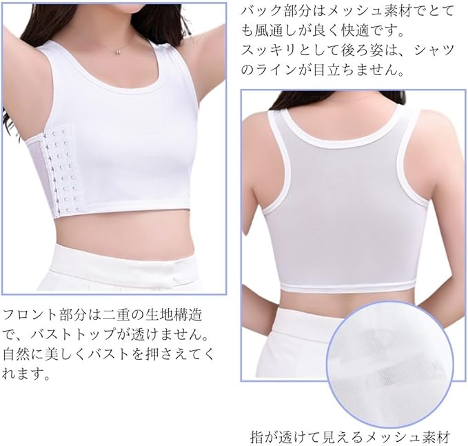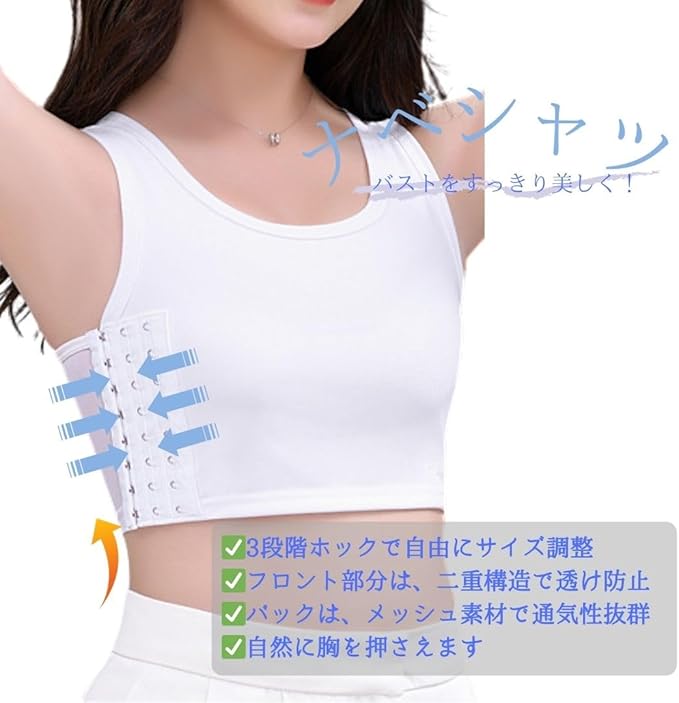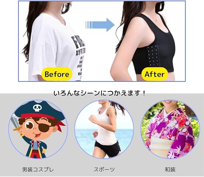 ①【自然な胸つぶしで理想のシルエットに】 胸をしっかり押さえてフラットに整えることで、理想的なバストラインを実現します。男装やコスプレにも適しており、自然な見た目を追求した設計が魅力。補正下着としての役割もしっかり果たし、胸元の悩みに悩む方にもおすすめできる一枚です。太って見える、揺れて痛いなどの悩みもスマートにカバーします。