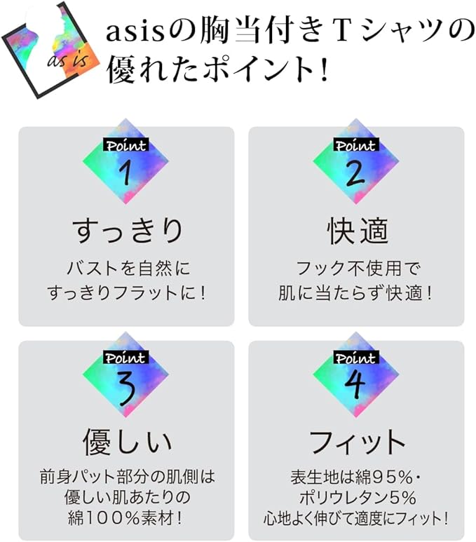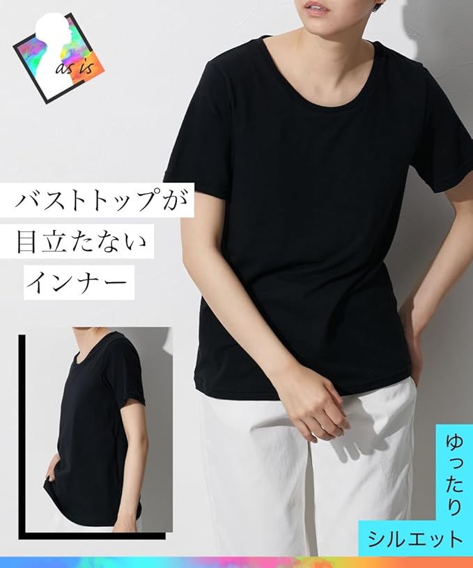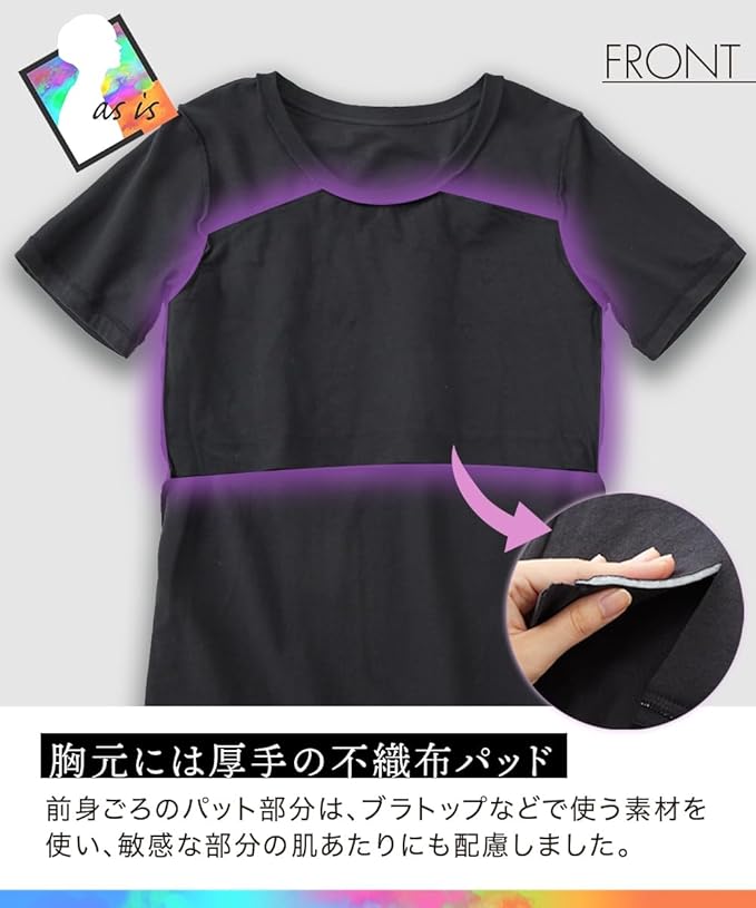 バストトップが気になるけどブラジャーを付けるのには抵抗がある。そんな方のために胸当付きでバストトップを目立たなくするTシャツです。パワーネット不使用だからリラックス時にも。