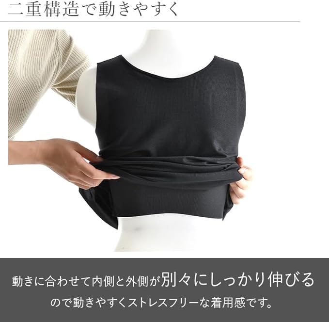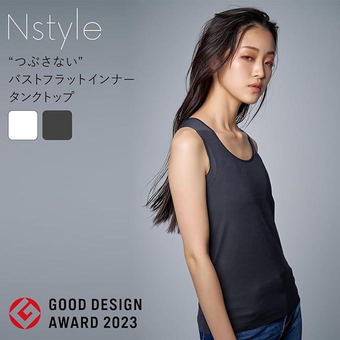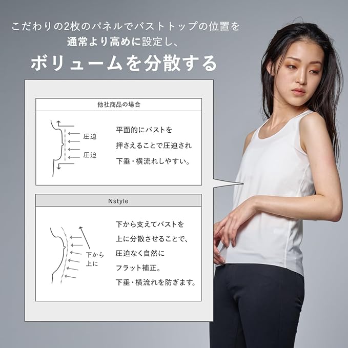 【バストを快適にフラットにする『バストホルダーパネル』】Nstyleには補正下着メーカーこだわりの『バストホルダーパネル』を内蔵し、ホックなしでバストをフラットにするバストフラットインナーです。平面に押さえるのではなく、下から支えて上に分散させることで、圧迫なく自然にフラット補正。従来のブラジャーのパターンではなく、高さを押さえてすっきり整える構造を実現しました。こだわりの2枚のパネルで、バストラインをナチュラルにみせバストトップの位置を通常よりも高めに設定し、ボリュームを分散させます。動きに合わせて内側と外側が別々にしっかり伸びるので、動きやすくストレスフリーな苦しくない着用感。胸下センターホール、胸周りの表側は吸水速乾不織布でムレやすい部分の通気性を高めました。また、胸周りの肌側は、お肌に優しいコットン天竺を使用しています。ナベシャツ初心者の方にもおすすめです。