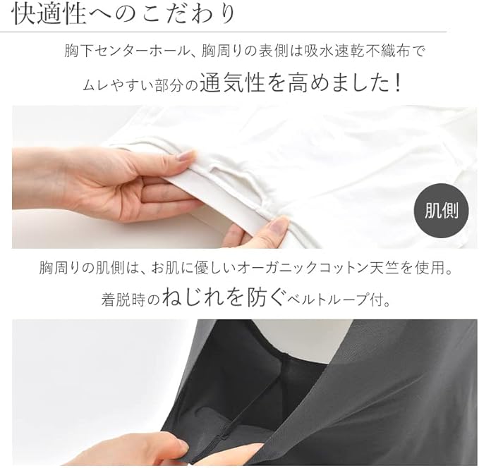【ご注意】脇部分のベルトループ(紐)は、着脱時のねじれを防ぐためのものです。大きな力がかかると切れてしまう場合がありますので着脱の際はご注意ください。ベルトループ(紐)が切れてもバストをフラットにする効果に影響はございません。