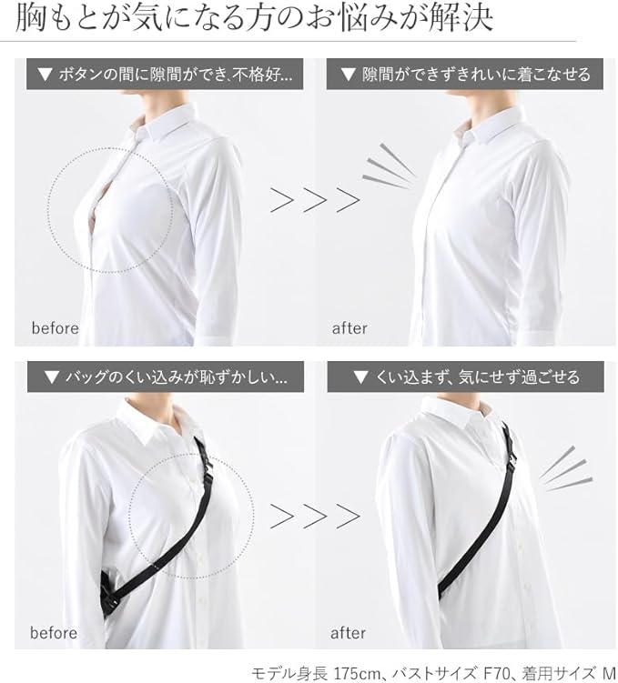 【こんな方におすすめ】バストのボリュームが気になる、バストを小さく見せたい、メンズ服を自然に着こなしたい、ショルダーバッグのくい込みが恥ずかしい、ゆったりした服を着ると太って見える、運動時のバストの揺れが気になる、和装用に、男装コスプレ用に。