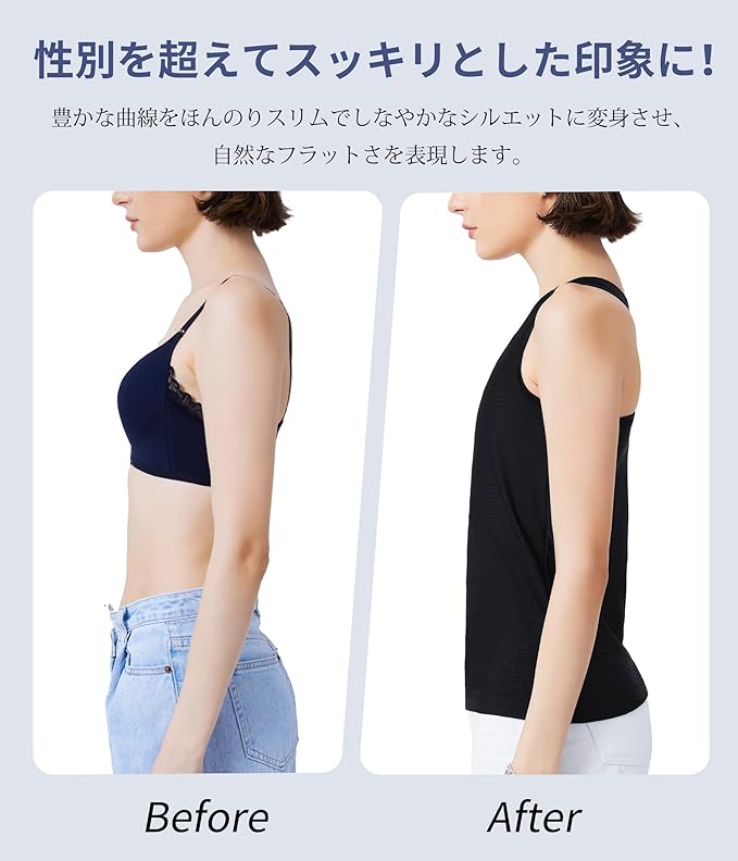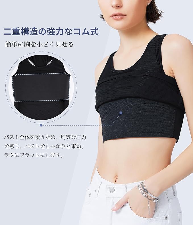 5:【全ての人に開かれた選択肢】:男装やコスプレ愛好者まで、胸を平らにして男性らしい魅力を引き出すことを望んでいる全ての人に、このコスプレ 胸潰しが最適!大胸の方でも、このブラジャー 小さく見せるブラで思わず目を奪われる美しいシルエットを手に入れることができます。