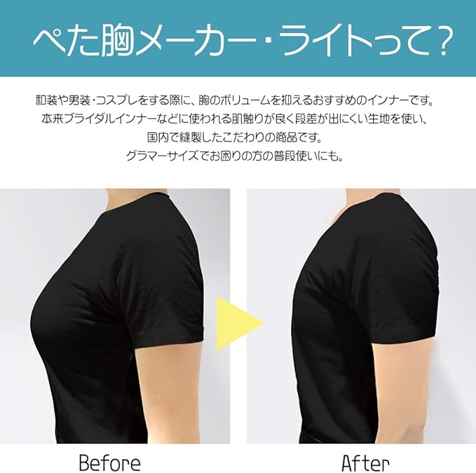 ボリュームのあるバストをほぼ平らにメイク / 和装や男装・ボーイッシュなコスプレ・痩せ見せさせたい人の胸つぶしブラ / グラマーサイズでお困りの方の普段使いにもOK / 胸が大きくても色々な服が着れる / ジョギングなどの運動時、胸の揺れが気にならない / 伸縮性に優れた生地で長時間着用しても苦しくない / 通気性に優れたメッシュ素材 / 脇肉・背中肉をスッキリ補正 / 安心の日本製 / トランスジェンダーも応援します / ≪「ぺた胸メーカー」と「ぺた胸メーカー ライト」の違いについて≫「ぺた胸メーカー」と「ぺた胸メーカー ライト」は生地が違います。「ぺた胸メーカー」は、ヘムサテンを使用。「ぺた胸メーカー ライト」は、パワーネットを使用しておりメッシュ調です。また、メッシュ調のため通気性も良く同じ特許製法ですが、より胸がつぶれるように開発されています。本来ブライダルインナーなどに使われる肌触りが良く段差が出にくい生地を使い、作り上げたこだわりの商品です。