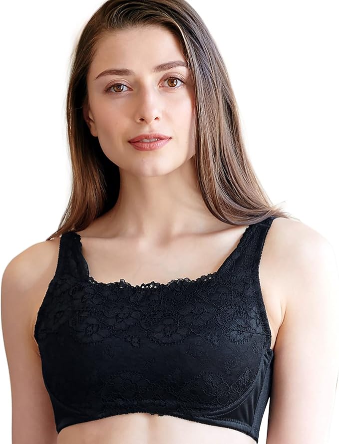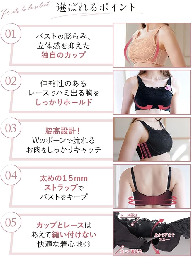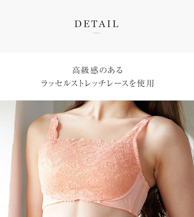 【伸縮性のあるレースではみ出る胸をしっかりホールド】フロント上部に伸縮性のあるゴムを入れ、視線が気になる谷間部分も高級感のあるラッセルストレッチレースでしっかりガード。さらに小胸に見えるよう設計しました。バスト全体をレースで覆っているので苦しくなりません。